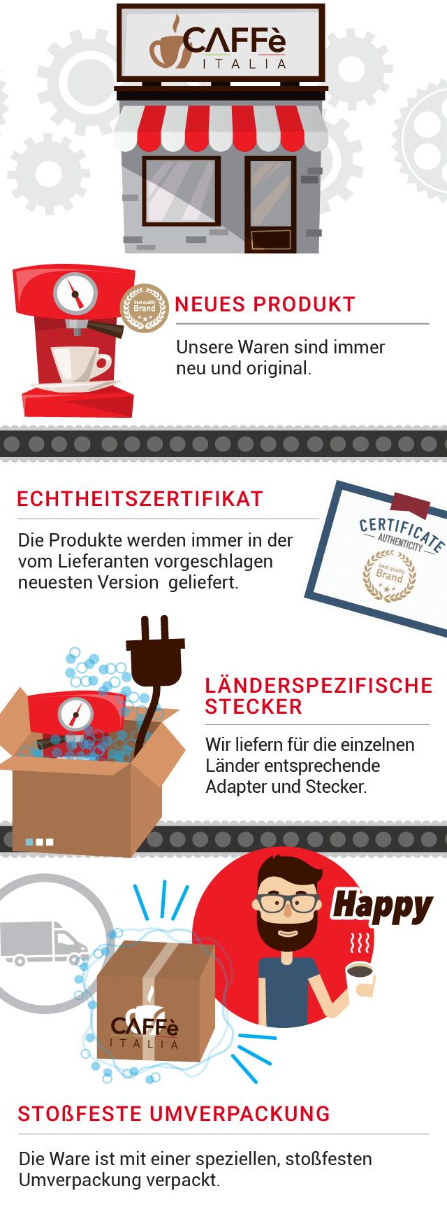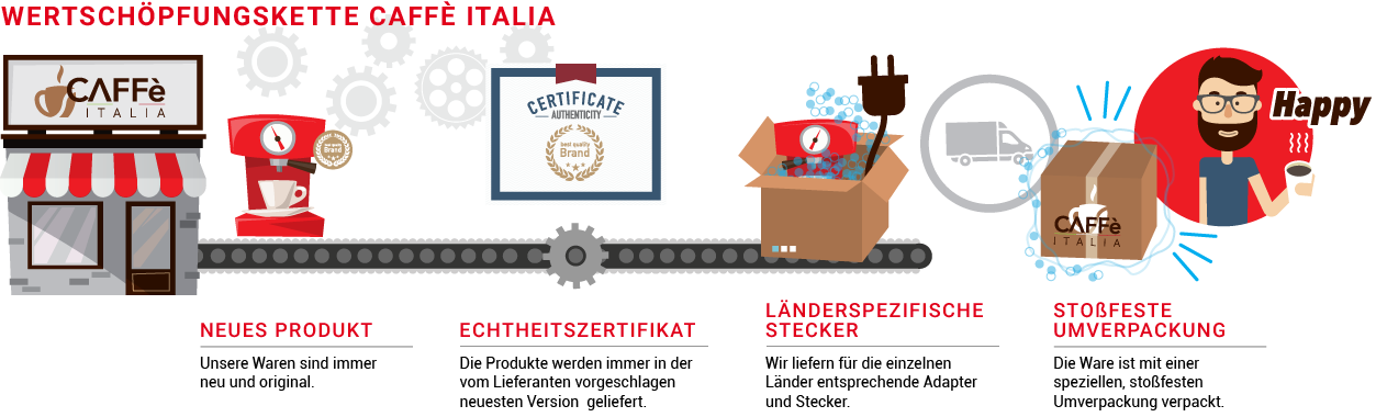Unser Ziel ist es, die besten Bedingungen für den Einkauf zu finden und die niedrigsten Preise des Marktes zu bieten. Mit dieser Philosophie bietet Ihnen Caffè Italia seine Jahrzehnte alte Erfahrung, um Ihnen zugleich die besten Qualitätsprodukte, die Dynamik seiner Angebote und einen optimalen Kundendienst zu gewährleisten. Wir liefern in kürzester Zeit in ganz Europa.