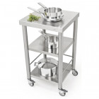 Küchenwagen aus Edelstahl der Serie Auxilium mit zwei Ablagen ohne Schublade. Die Arbeitsplatte aus Edelstahl ist robust und widerstandsfähig. Dieser Wagen ist für den Innen- sowie den Außenbereich geeignet.