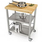 Küchenwagen aus Edelstahl der Serie Auxilium mit zwei Ablagen ohne Schublade. Die Arbeitsplatte aus Weißbuche Längsholz ist robust und widerstandsfähig.
