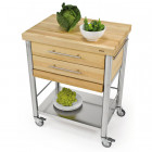 Küchenwagen aus Weißbuche der Serie Auxilium mit zwei Schubladen, einem Auszugsschneidbrett und einer Ablage. Die Arbeitsplatte aus Weißbuche Längsholz ist robust und widerstandsfähig. Die Schubladen sind aus Edelstahl und können zur Reinigung ausgeklinkt werden. Das Auszugschneidbrett aus Weißbuche ist unter der zweiten Schublade positioniert. Diese Schneidbrett kann auf die Arbeitsplatte gelegt werden und wird durch eine Anschlagleiste festgehalten. Der Küchenwagen hat links und rechts je eine Reeling zur Bestückung von Zubehör oder zum Beispiel Küchentücher.