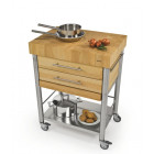 Küchenwagen aus Weißbuche der Serie Auxilium mit zwei Schubladen, einem Auszugsschneidbrett und einer Ablage. Die Arbeitsplatte aus Weißbuche Stirnholz ist robust und widerstandsfähig. Die Schubladen sind aus Edelstahl und können zur Reinigung ausgeklinkt werden. Das Auszugschneidbrett aus Weißbuche ist unter der zweiten Schublade positioniert. Dieses Schneidbrett kann auf die Arbeitsplatte gelegt werden und wird durch eine Anschlagleiste festgehalten. Der Küchenwagen hat links und rechts je eine Reeling zur Bestückung von Zubehör oder zum Beispiel Küchentücher.
